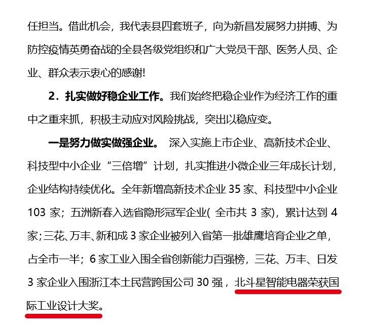 在大會(huì)上,新昌縣委書記李寧還點(diǎn)名表?yè)P(yáng)了北斗星智能電器榮獲國(guó)際工業(yè)設(shè)計(jì)大獎(jiǎng)。